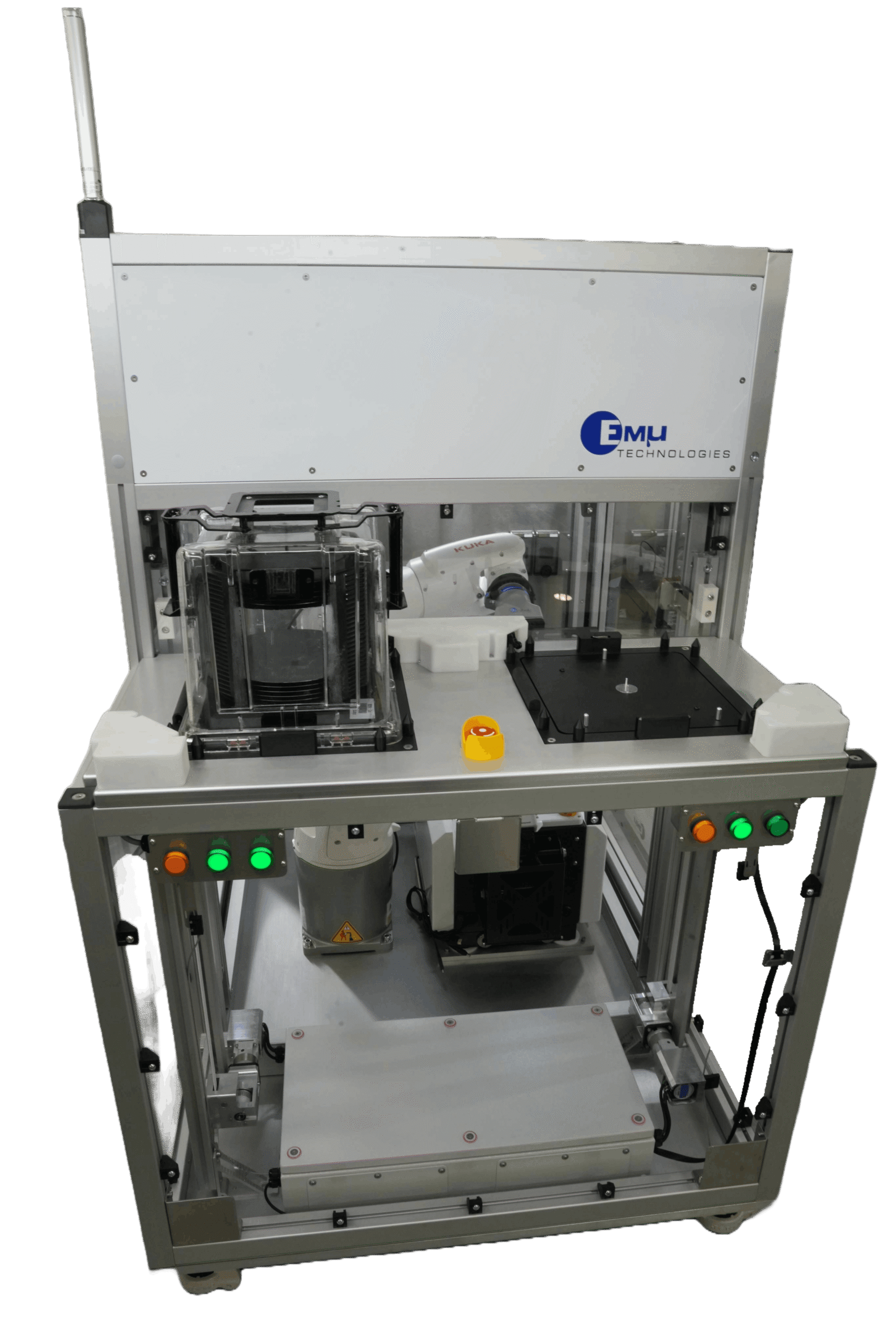 The machine combines 2x enclosed SMIF Load Ports, Kuka Robotics and EMU’s Batch ID Reader to offer SMIF Fabs a Batch Tracking solution with a 3 minute 30 second cycle time.